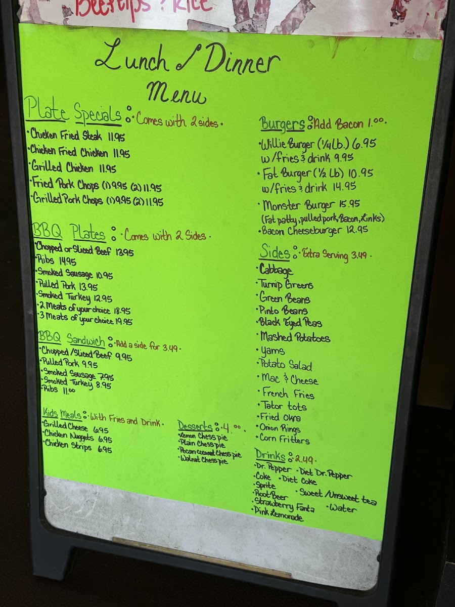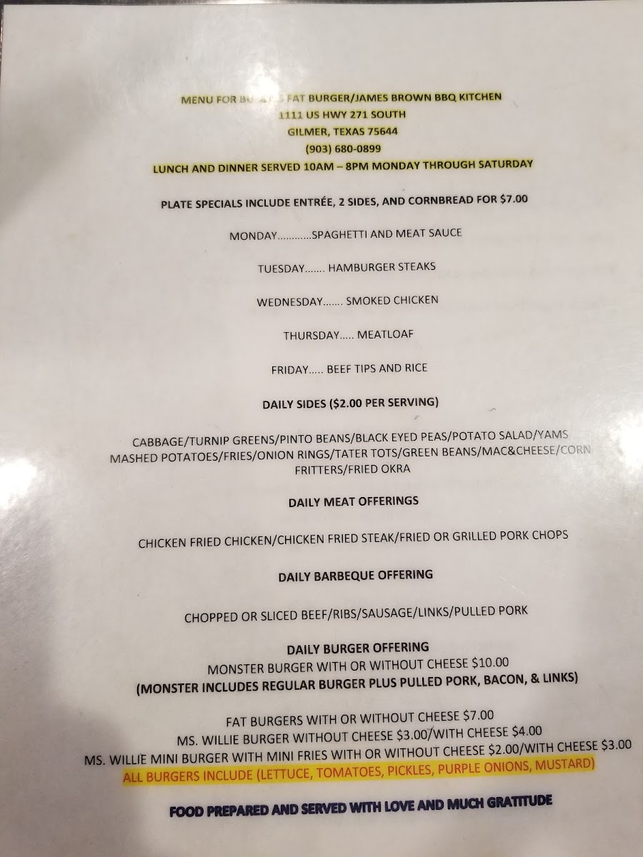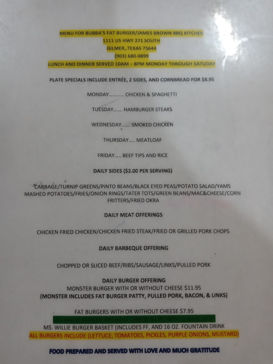 Welcome to Bubba's Fat Burgers & BBQ, where mouthwatering flavors meet unbeatable prices! Nestled at 1111 S Wood St, Gilmer, TX, our menu is a feast for the senses. Dive into our signature items like the Fat Burger, a towering delight that's sure to satisfy, or indulge in our savory Chicken Fried Steak served with creamy mashed potatoes. Craving something smoky? Don't miss our tender smoked chicken or the succulent ribs and sliced brisket that will have you coming back for more. And for those who lean towards comfort food, our yams and fried okra are the perfect sidekick to any meal! So whether you choose the juicy Bacon Cheeseburger All the Way or the hearty Bubba's Burger Combo with a side of tater tots, each bite promises to be unforgettable. Join us and taste the difference at Bubba's Fat Burgers & BBQ—your new favorite burger and BBQ spot awaits!